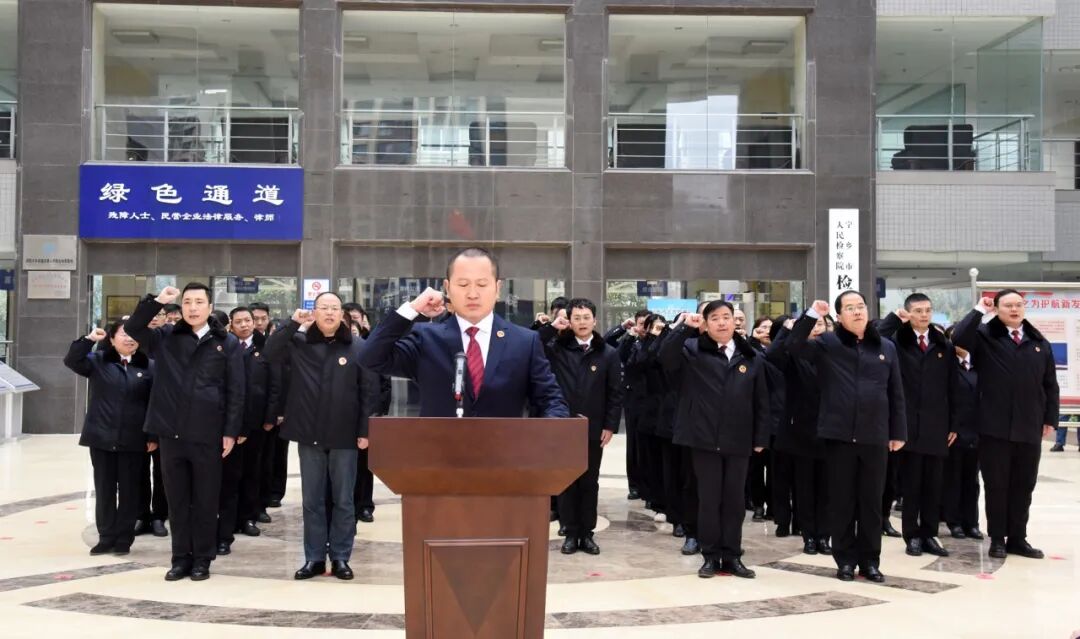 “我宣誓,忠于中华人民共和国宪法,维护宪法权威,履行法定职责……” 仪式上,全体干警面向国旗、奏唱国歌。在党组书记、检察长刘文广的领誓下,高举右手、目光坚定、庄严宣誓。一声声铿锵有力的宪法誓言,字字千钧,表达出检察干警对党和人民、宪法和法律作出的庄严承诺。